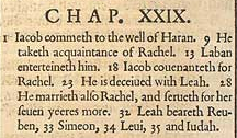 1 Jakob kommt zum Brunnen von Haran. 9 Er macht Bekanntschaft mit Rachel. 13 Laban unterhält ihn. 18 Jakob schwört für Rachel. 23 Er wird mit Lea betrogen. 28 Er heiratet auch Rachel und dient für sie sieben Jahre mehr. 32 Lea gebärt Ruben, 33 Simeon, 34 Levi 25 und Juda.