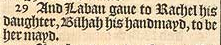 29 And Laban gaue to Rachel his daughter, Bilhah his handmayd, to be her mayd.