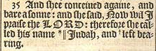 35 And shee conceiued againe, and bare a sonne: and she said, Now wil I praise the LORD: therefore she called his name *|| Iudah, and +left bearing. [ * Matth. 1. 2. , || That is, Praise. ,+ Hebr. stood from bearing. ]