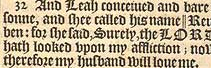 32 And Leah conceiued and bare a sonne, and shee called his name || Reuben: for she said, Surely, the LORD hath looked vpon my affliction; now therefore my husband will loue me. [ || That is, See a sonne. ]