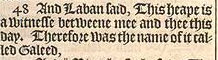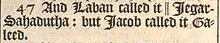 47 And Laban called it || Iegar-Sahadutha: but Iacob called it Galeed. [ || That is, The heape of witnesse. ]