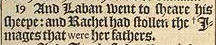 19 And Laban went to sheare his sheepe: and Rachel had stollen the +Images that were her fathers. [ + Hebr. Teraphim. ]