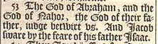 53 The God of Abraham, and the God of Nahor, the God of their father, iudge betwixt vs. And Iacob sware by the feare of his father Isaac.
