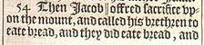 54 Then Iacob || offred sacrifice vpon the mount, and called his brethren to eate bread, and they did eate bread, and taried all night in the mount. [ || Or, killed beasts. ]