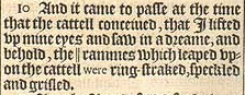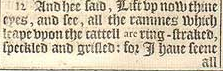 10 And it came to passe at the time that the cattell conceiued, that I lifted vp mine eyes and saw in a dreame, and behold, the || rammes which leaped vpon the cattell were ring-straked, speckled and grisled. [ || Or, hee goates. ]