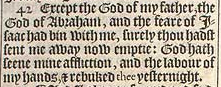 42 Except the God of my father, the God of Abraham, and the feare of Isaac had bin with me, surely thou hadst sent me away now emptie: God hath seene mine affliction, and the labour of my hands, & rebuked thee yesternight.