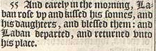 55 And earely in the morning, Laban rose vp and kissed his sonnes, and his daughters, and blessed them: and Laban departed, and returned vnto his place.