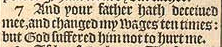 7 And your father hath deceiued mee, and changed my wages ten times: but God suffered him not to hurt me.