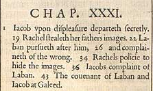 1 Jakob geht aus Verdruss heimlich weg. 19 Rahel stielt die Bilder ihres Vaters. 22 Laban verfolgt ihn, 26 und scheltet den Falschen. 34 Rahels Methode die Bilder zu verbergen. 36 Jakobs Schelte von Laban. 43 Der Bund von Laban und Jakob in Gal-Ed.