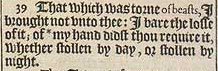 39 That which was torne of beasts, I brought not vnto thee: I bare the losse of it; of *my hand didst thou require it, whether stollen by day, or stollen by night. [ *Exod.22. 12. ]