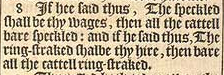 8 If hee said thus, The speckled shall be thy wages, then all the cattell bare speckled: and if he said thus, The ring-straked shalbe thy hire, then bare all the cattell ring-straked.