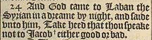 24 And God came to Laban the Syrian in a dreame by night, and saide vnto him, Take heed that thou speake not to Iacob +either good or bad. [ +Hebr. from good to bad. ]