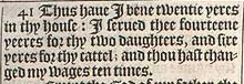 41Thus have I bene twentie yeres in thy house: I serued thee fourteene yeeres for thy two daughters, and sixe yeres for thy cattel; and thou hast changed my wages ten times.