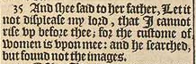35 And shee said to her father, Let it not displease my lord, that I cannot rise vp before thee; for the custome of women is vpon mee: and he searched, but found not the images.