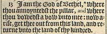 13 I am the God of Bethel, *where thou annoyntedst the pillar, and where thou vowedst a vow vnto mee: now arise, get thee out from this land, and returne vnto the land of thy kindred. [ * Chap. 28. 18. ]