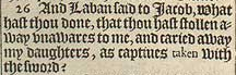 26 And Laban said to Iacob, What hast thou done, that thou hast stollen away vnawares to me, and caried away my daughters, as captiues taken with the sword?