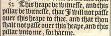 52 This heape be witnesse, and this pillar be witnesse, that I will not passe ouer this heape to thee, and that thou shalt not passe ouer this heape, and this pillar vnto me, for harme.