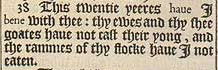 38 This twentie yeeres haue I bene with thee: thy ewes and thy shee goates haue not cast their yong, and the rammes of thy flocke haue I not eaten.
