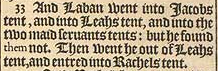 33 And Laban went into Iacobs tent, and into Leahs tent, and into the two maid seruants tents: but he found them not. Then went he out of Leahs tent, and entred into Rachels tent.