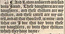 43 ¶ And Laban answered and said vnto Iacob, These daughters are my daughters, and these children are my children, and these cattell are my cattell, and all that thou seest, is mine: and what can I doe this day vnto these my daughters, or vnto their children which they haue borne?