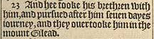 23 And hee tooke his brethren with him, and pursued after him seuen dayes iourney, and they ouertooke him in the mount Gilead.