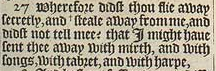 27 Wherefore didst thou flie away secretly, and +steale away from me, and didst not tell mee? that I might haue sent thee away with mirth, and with songs, with tabret, and with harpe, [ +Hebr. hast stollen me. ]