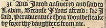 31 And Iacob answered and said to Laban, Because I was afraid: for I said, Peraduenture thou wouldest take by force thy daughters from me.