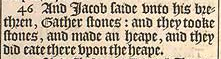 46 And Iacob saide vnto his brethren, Gather stones: and they tooke stones, and made an heape, and they did eate there vpon the heape.