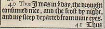 40 Thus I was in þe day, the drought consumed mee, and the frost by night, aud my sleep departed from mine eyes.