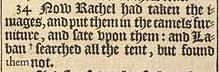 34 Now Rachel had taken the images, and put them in the camels furniture, and sate vpon them: and Laban +searched all the tent, but found them not. [+ Hebr. felt. ]