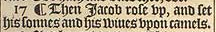 17 ¶ Then Iacob rose vp, and set his sonnes and his wiues vpon camels.