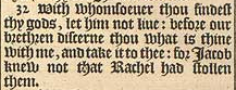 32 With whomsoeuer thou findest thy gods, let him not liue: before our brethren discerne thou what is thine with me, and take it to thee: for Iacob knew not that Rachel had stollen them.