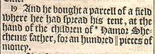 19 And he bought a parcell of a field where hee had spread his tent, at the hand of the children of * Hamor Shechems father, for an hundred || pieces of money. [ * Called Acts. 7. 16. Emor. , || Or, lambes. ]
