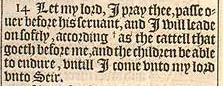 14 Let my lord, I pray thee, passe ouer before his seruant, and I will leade on softly, according +as the cattell that goeth before me, and the children be able to endure, vntill I come vnto my lord vnto Seir. [ + Heb. according to the foote of the worke, &c. & according to the foot of the children. ]