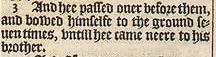 3 And hee passed ouer before them, and bowed himselfe to the ground seuen times, vntill hee came neere to his brother.