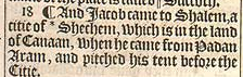 18 ¶ And Iacob came to Shalem, a citie of *Shechem, which is the land of Canaan, when he came from Padan Aram, and pitched his tent before the Citie. [ * Called Acts. 7. 16. Sychem. ]