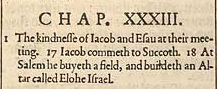 1 Die Freundlichkeit von Jakob und Esau auf ihrem Treffen. 17 Jakob kommt nach Sukkot. 18 Bei Salem kauft er ein Feld und baut einen Altar, benannt Elohe Israel.