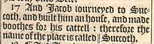17 And Iacob iourneyed to Succoth, and built him an house, and made boothes for his cattell: therefore the name of the place is called || Succoth. [ || That is, boothes. ]