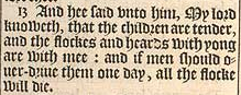 13 Und er sagte zu ihm “Mein Herr weiß, dass die Kinder zart sind und die Schafherden und Herden mit Jungen sind mit mir: Und wenn Männer sie eines Tages zuviel treiben, sterben sie.