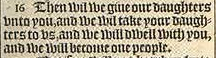 16 Then wil we giue our daughters vnto you, and we wil take your daughters to vs, and we will dwell with you, and we will become one people.