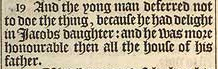 19And the yong man deferred not to doe the thing, because he had delight in Iacobs daughter: and he was more honourable then all the house of his father.
