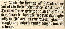 7 Und die Söhne Jakobs kamen aus dem Feld, als sie es hörten, und die Männer waren bekümmert: Und sie waren sehr zornig, weil er in Israel töricht gehandelt hatte, mit Jakobs Tochter zu schlafen; etas, dass nicht getan werden sollte.