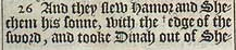 26 And they slew Hamor and Shechem his sonne, with the +edge of the sword, and tooke Dinah out of Shechems house, and went out. [ +Hebr. mouth. ]