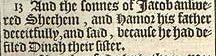 2 Und als Sichem, der Sohn von Hemor dem Hititer, Fürst des Landes, sie sah, nahm er sie, schlief mit ihr und +schändete sie.[+Hebr.: demütigte sie]
