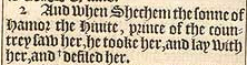 2 And when Shechem the sonne of Hamor the Hiuite, prince of the countrey saw her, he tooke her, and lay with her, and +defiled her. [ + Hebr. humbled her.]