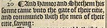 20 ¶ And Hamor and Shechem his sonne came vnto the gate of their citie, and communed with the men of their citie, saying: