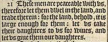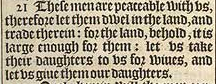 21 These men are peaceable with vs, therefore let them dwel in the land, and trade therein: for the land, behold, it is large enough for them: let vs take their daughters to vs for wiues, and let vs giue them our daughters.
