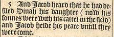 5 And Iacob heard that he had defiled Dinah his daughter (now his sonnes were with his cattel in the field) and Iacob helde his peace vntill they were come.