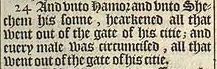 24 And vnto Hamor and vnto Shechem his sonne, hearkened all that went out of the gate of his citie; and euery male was circumcised, all that went out of the gate of his citie.