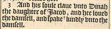 3 And his soule claue vnto Dinah the daughter of Iacob, and hee loued the damsell, and spake +kindly vnto the damsell. [ +Hebr. to her heart. ]